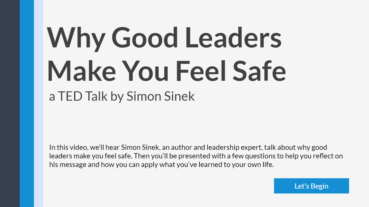 Learning journals are an effective way to provide reflection opportunities within an eLearning course. This sample came from a constraint at work - we wanted to see what kind of leadership development we could provide without the budget to purchase off-the-shelf courses. After watching a 12 minute video, you will be prompted with questions that allow you to reflect on the content and identify ways to apply it in your life. Your responses can be printed at the end, which could be handed off to a manager or mentor to help hold you accountable for what you intend to apply.